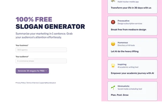 Input a business description, and the Slogan Generator AI will generate 30 potential marketing slogans.