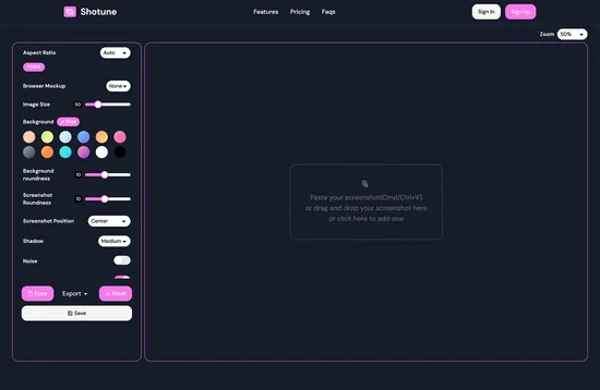 Shotune is an online tool for creating and editing screenshots with browser mock-ups and customizable backgrounds.