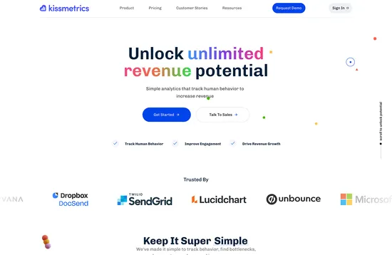 Kissmetrics is an event-tracking platform. Think of it as super-charged analytics. It’s an excellent tool for gathering information on how users interact with your site or app. You can follow a user journey through interactions and identify where users drop off, making it a great tool for refining your sales funnel and boosting revenue.