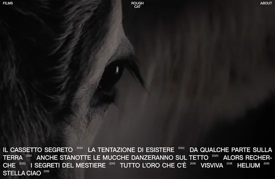 Independent film production company Rough Cat keeps things simple with links to video clips and a modal window for information. Visual interest is provided by fullscreen video on link hover.