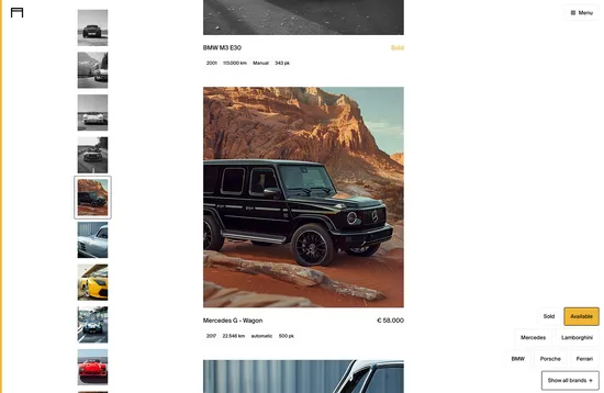 This might seem a little unprepossessing at first glance, but a closer look reveals some nice details: the garage door animated logo and color inversion for sold listings. The use of yellow and well-placed lines creates a retro aesthetic in a nod to the 1970s glory days of motorsport.