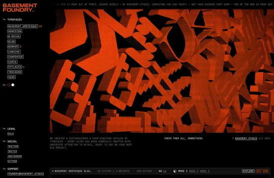 Basement Foundry is an offshoot of Basement design studio, and like its parent site, this makes a strong statement with lots of red on black (or white if the user prefers). This fits well with the display typefaces on offer.