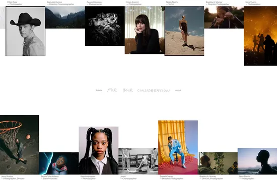 For Your Consideration is an agency representing a range of creative artists, mostly photographers. Navigation feels integrated with the content which increases engagement, but at the same time remains simple and clear.