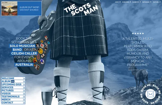 The Scotsman is a Scottish folk musician based in Australia. The site is a good combination of clear navigation and a lighthearted use of Scottish archetypal symbols.