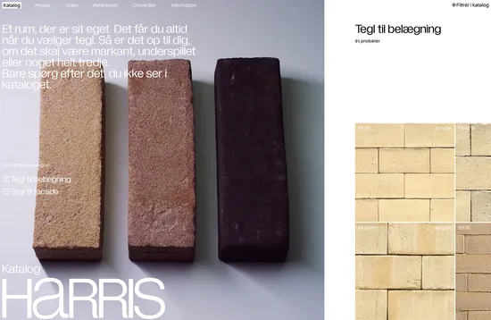 Horizontal scrolling, good images, and smooth animated transitions make this site for Harris paving tiles and bricks a pleasing experience to use.