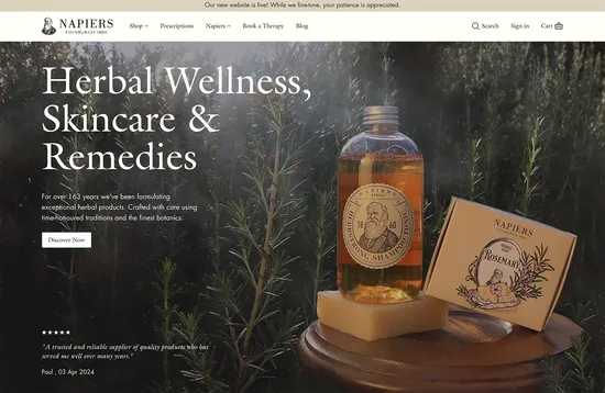 Napiers Herbalists have launched a new e-commerce site. It is built around a template, but the customization is well applied. Muted hues imbue a feeling of calm and reassurance, and the home page hero image is welcoming.