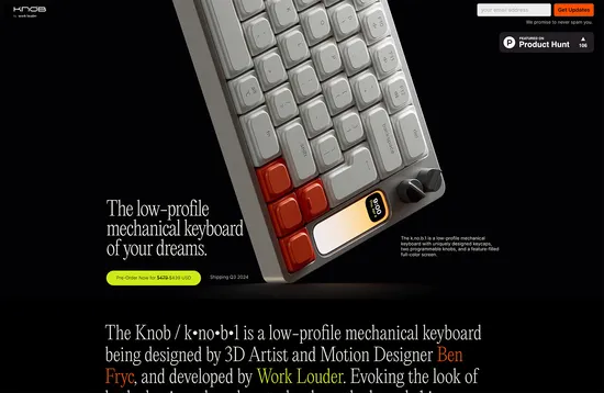 This promotional site for the Knob keyboard keeps things simple, with white on black, and close-ups of product details. Information is presented clearly and without unnecessary sales jargon.