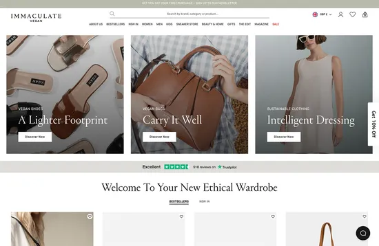 Online ethical clothing and home store Immaculate Vegan has updated its site to improve functionality. Navigation is clear and well structured, and individual brand information is available on demand.