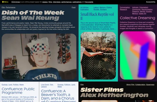 CCA Annex is an online extension of CCA providing space for digital projects. The home page presents works to view in a grid with no margins, creating a collage effect. It is busy without being cluttered.