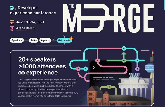 The Merge is a developer conference run by GitButler, and the motif of merging tracks is used well here as a design theme. The dark blue-purple background provides good contrast to candy-colored gradients.