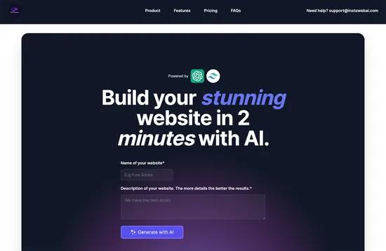 InstawebAI is an AI-powered website generator that claims to generate a unique website tailored to your business in a few minutes. It’s an excellent way to brainstorm ideas and see them in action.